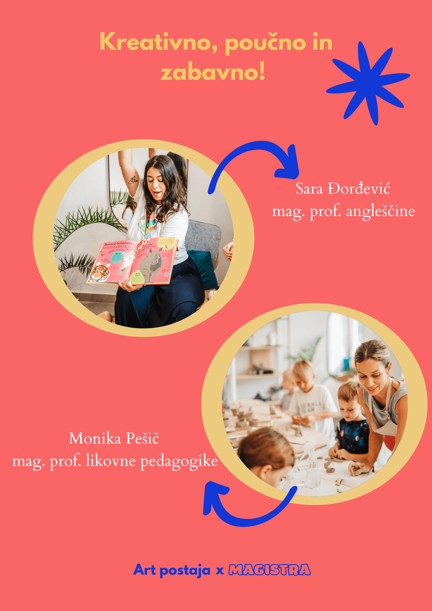 You can join us for a 4-hour programme (9.00-13.00) or an 8-hour programme (8.00-16.00, which includes lunch). The price includes all materials, workshops and activities from 8.00-16.00, lunch (8 hours) and tickets for the afternoon activities. The workshops will be led by: Monika Pešič, MA prof.of art education and painter, and Sara Đorđevič, MA prof. of English and French.