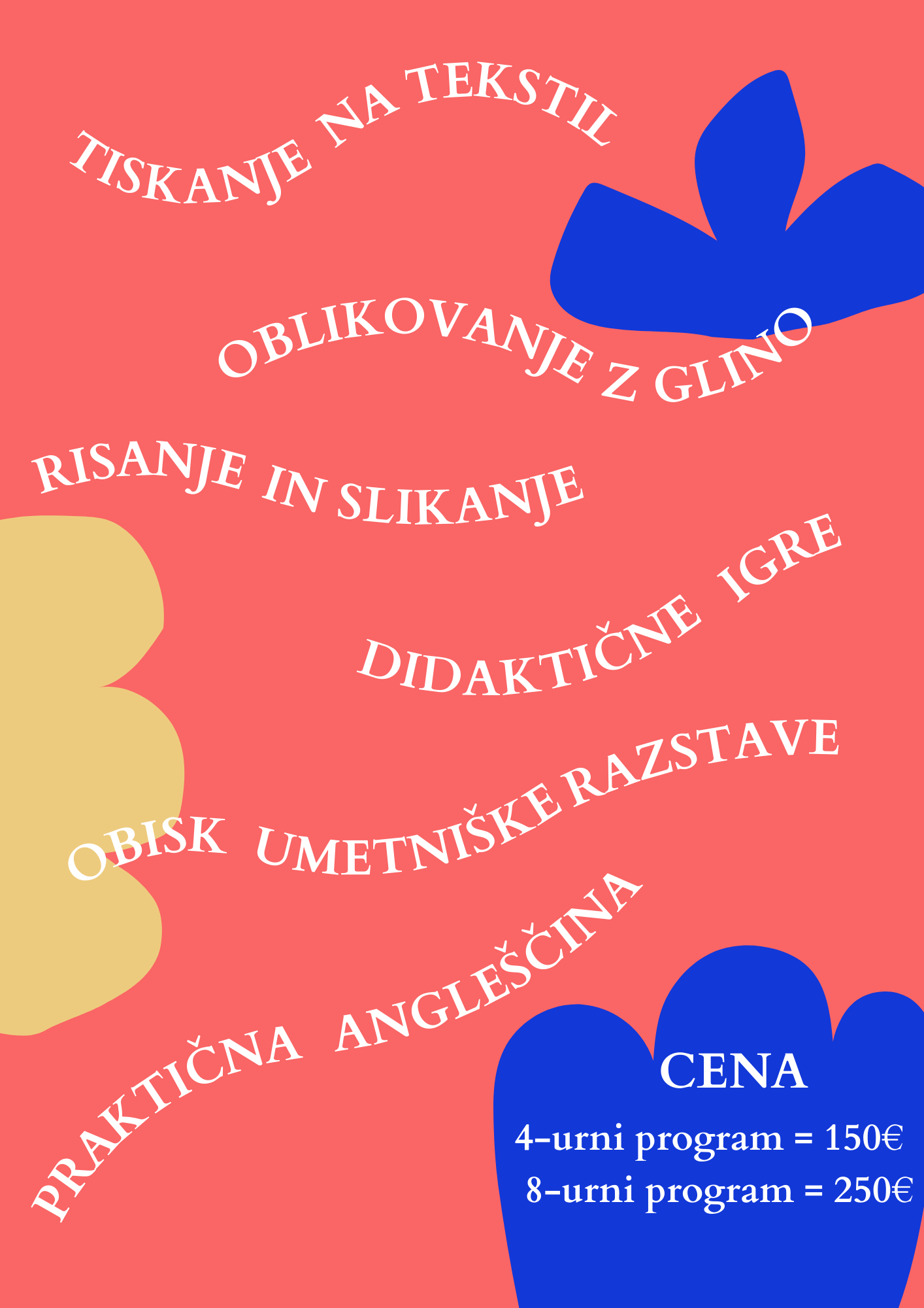 Pridružite se nam lahko na 4-urnem programu (9.00-13.00) ali na 8-urnem programu (8.00-16.00, v katerem je vključeno kosilo). V ceno je vključen ves material, delavnice in aktivnosti od 8.00-16.00, kosilo (8ur) in vstopnice za popoldanske aktivnosti. Ustvarjalnice bo vodila: mag. prof. likovne pedagogike in slikarka Monika Pešič in mag. prof. angleščine in francoščine Sara Đorđevič.